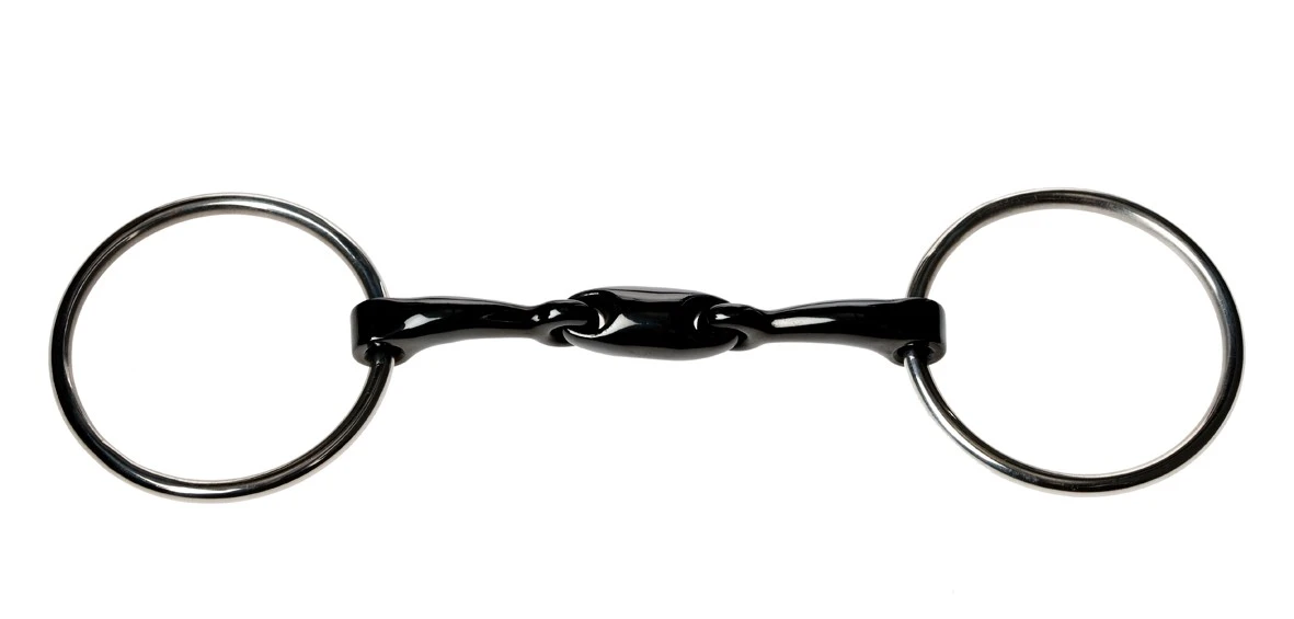 A mobile bit which discourages fixing and leaning on the forehand. Mild bit designed to allow the rider to have an independent control of each side of the mouth, preferable to horses with less palate clearance. The sweet iron mouth piece is warmer than other metals and encourages salivation and relaxation. Mild bit designed to create less pressure than a standard French link.