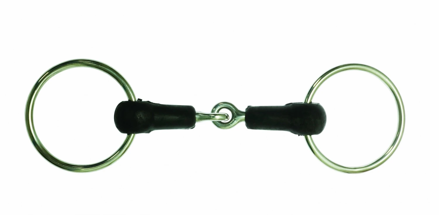 A mobile bit which discourages fixing and leaning on the forehand. The thicker mouthpiece is softer on the corners and the bars of the mouth. Pressure created by the reins is spread over a larger surface area. The hard rubber mouthpiece offers a warmer and softer option, creating a much milder bit. The single joint creates a nutcracker action which puts pressure on the tongue, the roof of the mouth and the bars of the mouth.