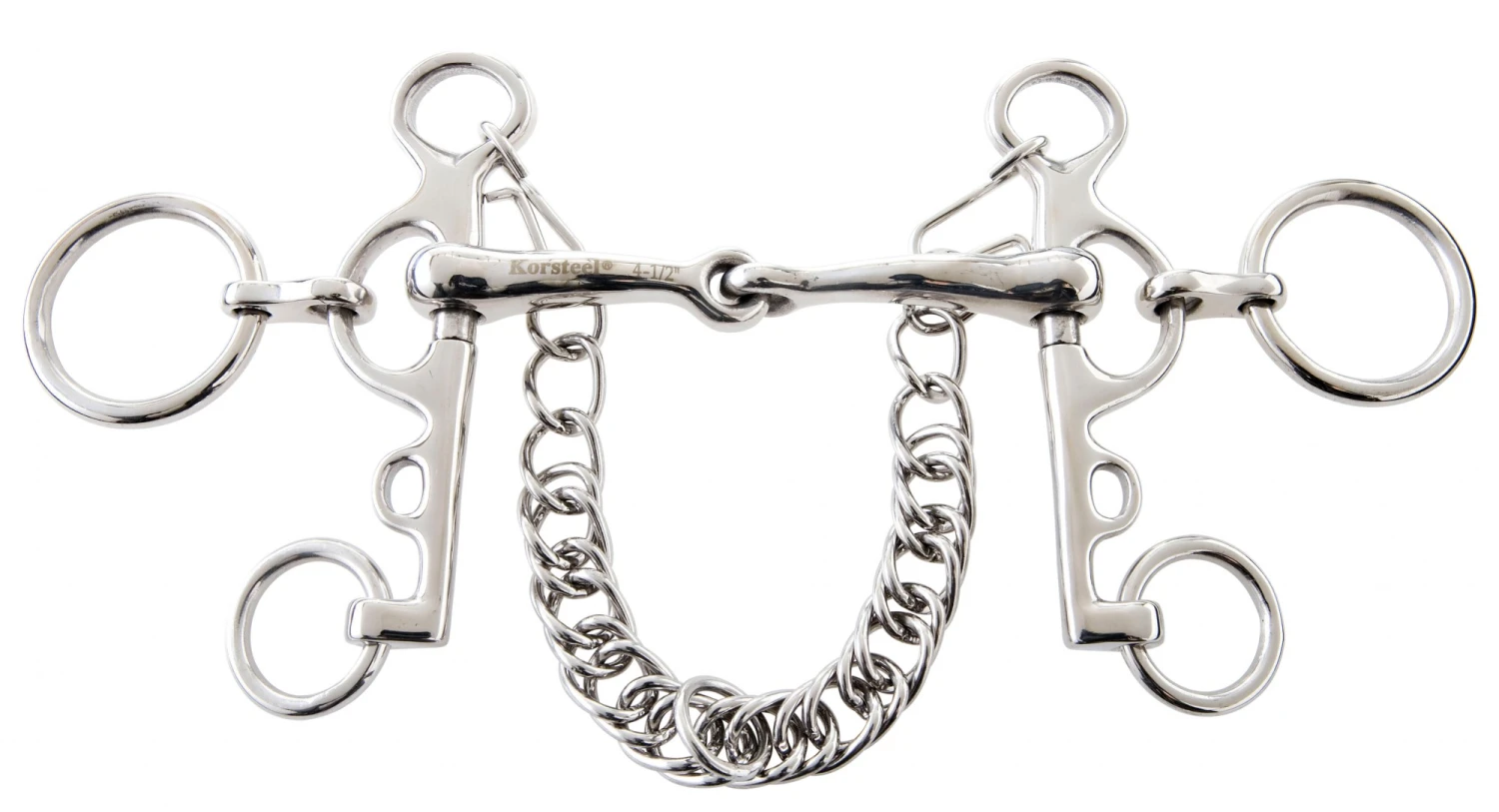 The top rein provides snaffle pressure to the tongue and corners of the mouth, while the bottom rein increases leverage and curb chain pressure