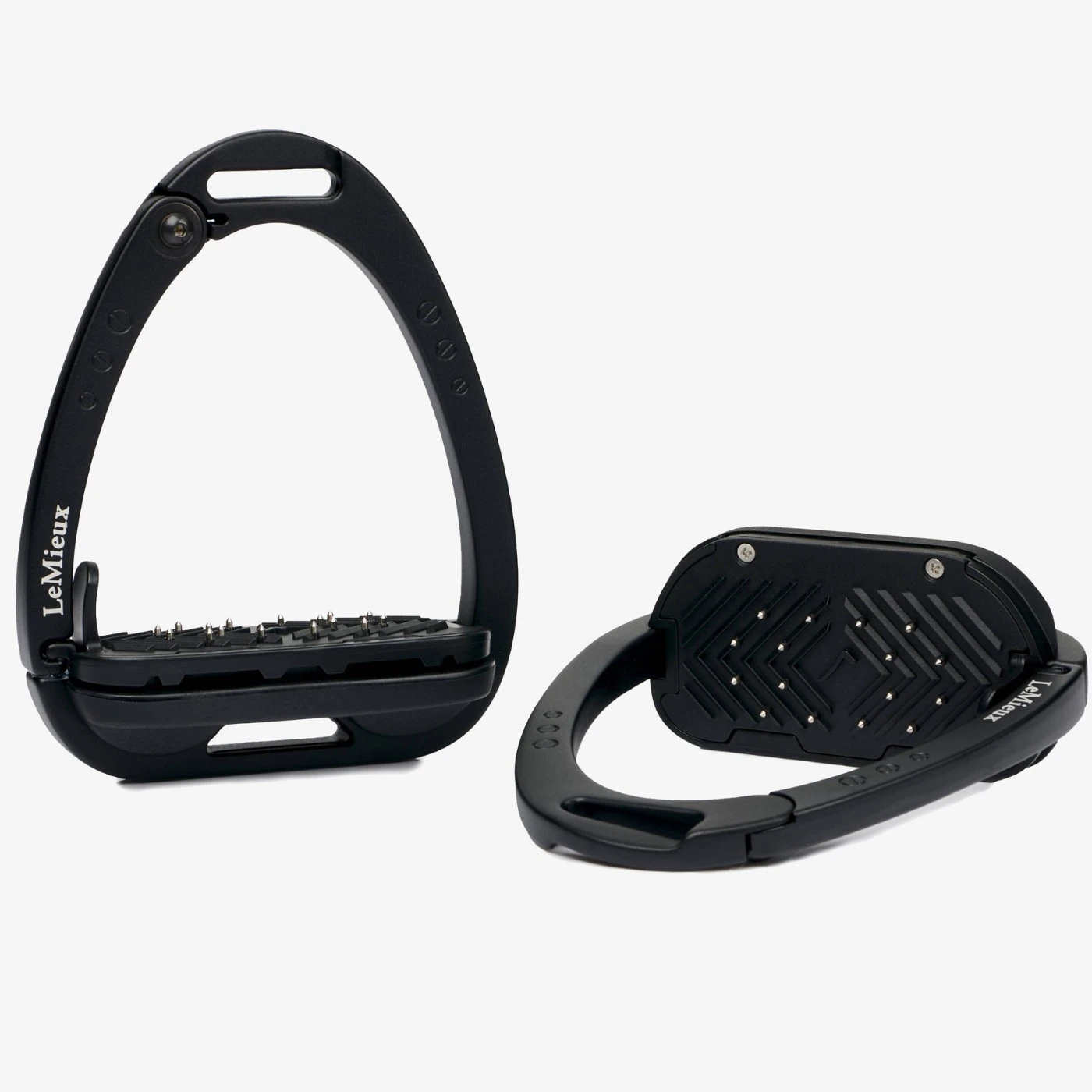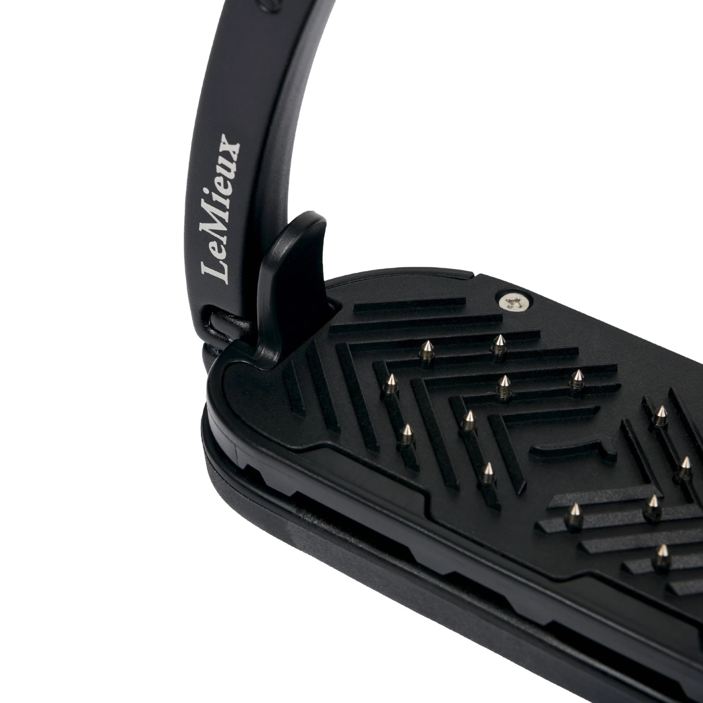The ergonomic footplate of the Control Stirrup is set at 0 degrees with a cross-track grip surface with embedded hardened steel pins to provide maximum security of the boot.