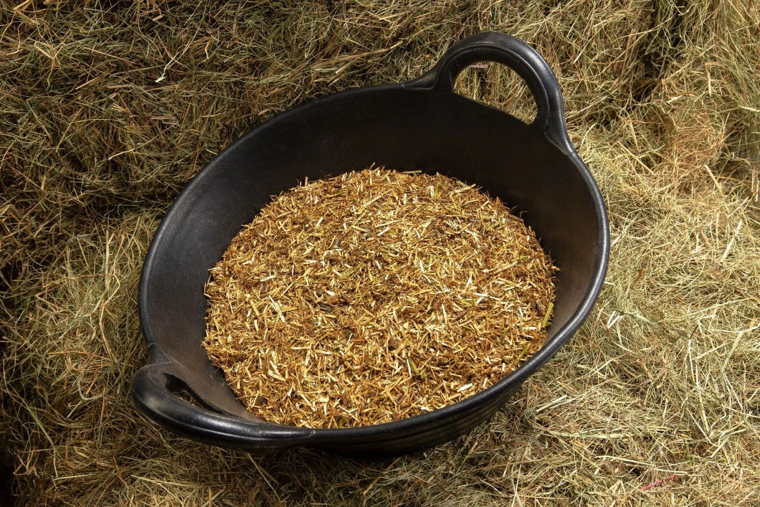 - Includes a blend of short chopped alfalfa and straw to extend eating time