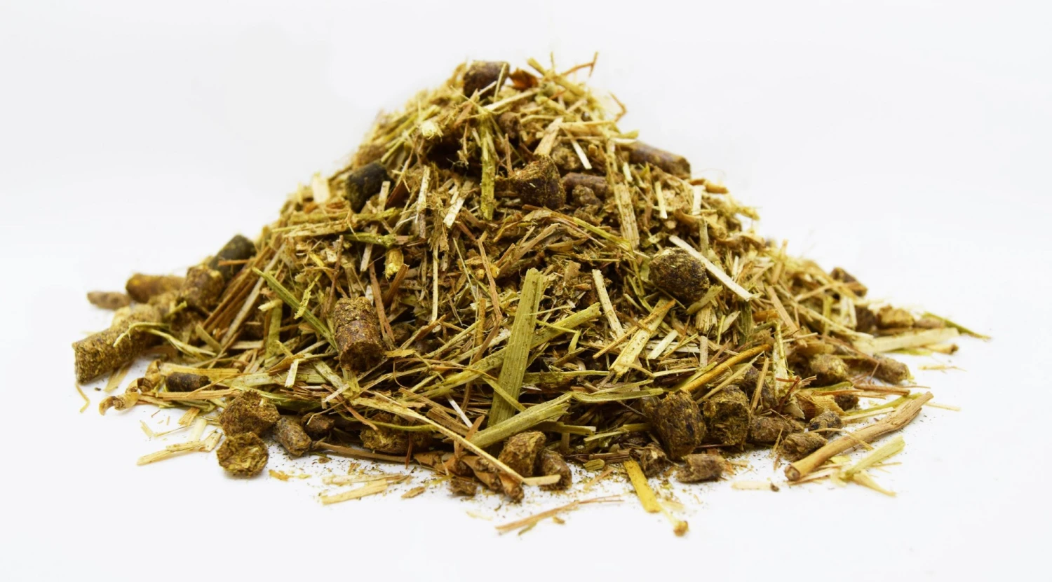 - Includes short chopped alfalfa and straw to help slow eating time.